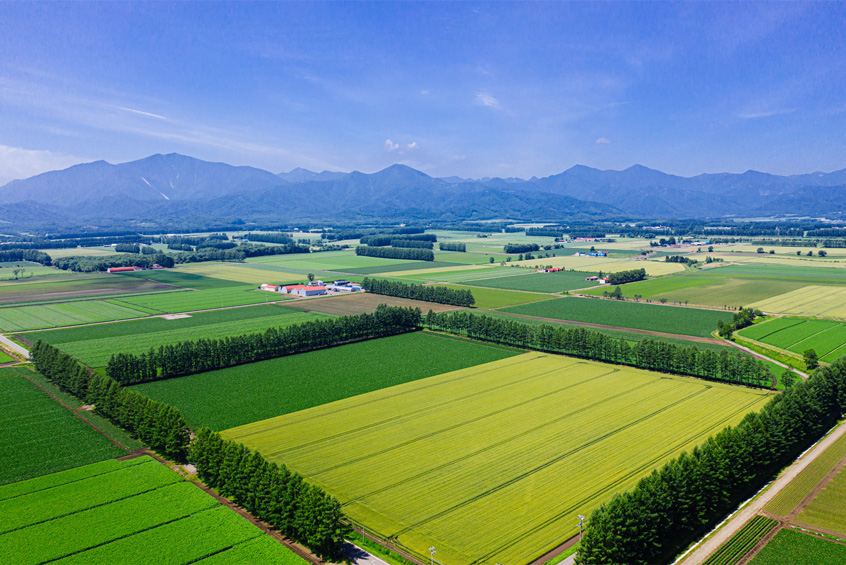 山本忠信商店の屋号の山、日高山脈/大雪山系を仰ぐ十勝平野の麦畑と小豆。生産者と実需者を信頼でつなぐ橋を表す
